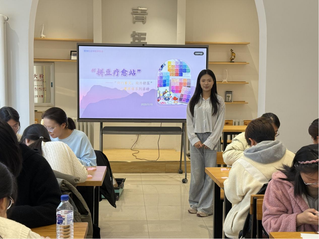 学生朋辈心理辅导员、2023级本科生王晨烨同学向参加活动的同学们详细介绍了本次心理团辅的主题和目的,引导大家根据自身情况填写情绪调查问卷,帮助大家快速进入活动状态;并让大家选择1-2种拼豆颜色来代表当下的情绪,让抽象的情绪变得具象化,进而更好地帮助同学们释放内心感受。