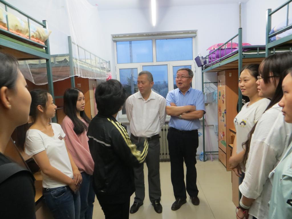 领导本着“以生为本”的思想,于8月27号晚上6点走进了大一新生宿舍,探访慰问新生。此次参与看望新生的领导有91国产