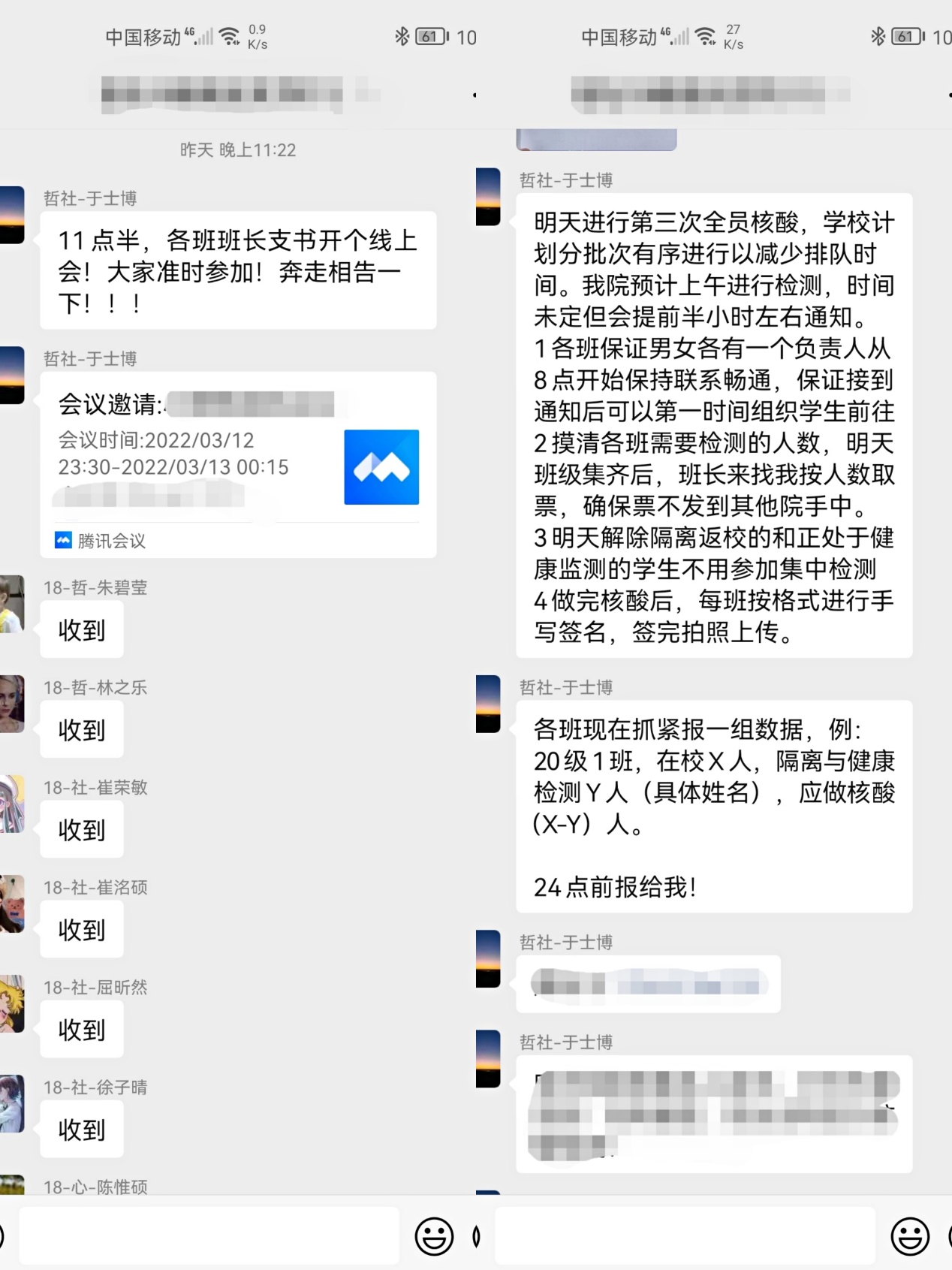 老师们积极响应学校有关工作部署,按照要求主动来到校园,入住学生公寓,倾听学生需求,及时帮助同学解决当前面临的实际问题,获得了同学们的广泛认可;面对尚不确定的疫情防控形势,各位老师与各年级各班主要学生干部、党员同学连夜开会,商讨解决办法,一系列工作任务最终精准地传达到每一位同学处,此时此刻,广大哲社学子正有序地居住在寝室中,等待学校和学院的进一步通知。