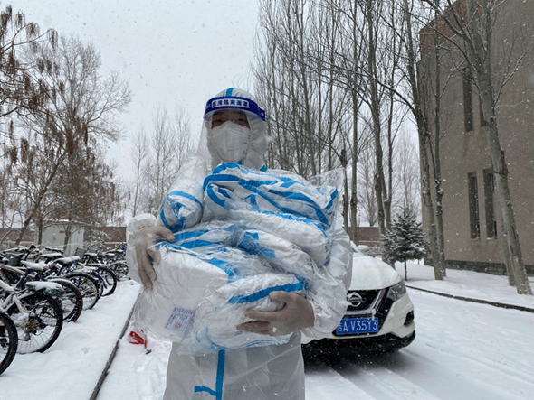 南区“快递员”团委书记于士博老师。在学校封校后,于老师第一时间打包行李入住学校,立刻投入校内防疫工作,负责整个南区的物资配送工作。于老师每天都要工作十几个小时,保障各类防疫物资及时送达。他穿着厚重的防护服,抱着防疫物资在冰天雪地里艰难行走,始终奔波在为学生服务的第一线,积极地为同学们解决实际困难。于老师在为同学们服务的同时,也不忘关心大家的学习和日常生活,从防疫到生活,他事无巨细。于老师用自己的认真负责和无私奉献温暖了所有学生,也践行着青年人的责任与担当,为同学们树立了榜样!我们都始终相信,“吉林必有吉临时,长春必复往常春”!