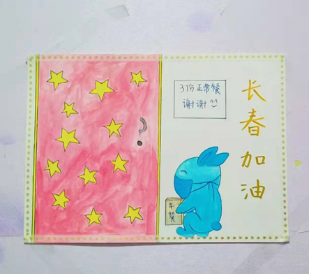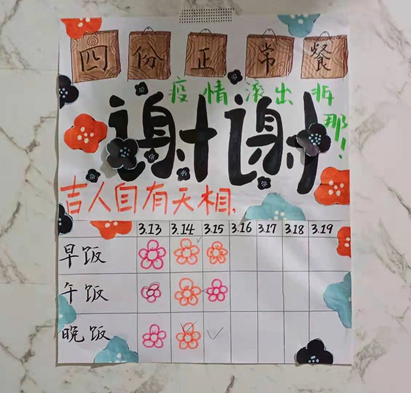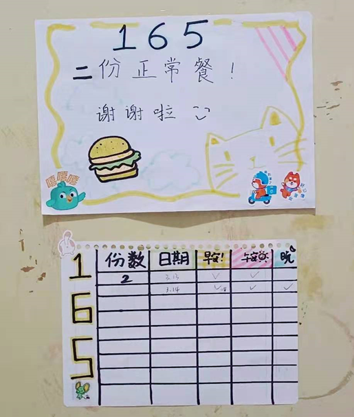 为了答谢志愿者的辛苦劳动和无私付出,南四同学们也纷纷画出了可爱的送餐表张贴在宿舍门口,温暖了正在奋斗的志愿者,希望的嫩芽正在悄然萌发。
