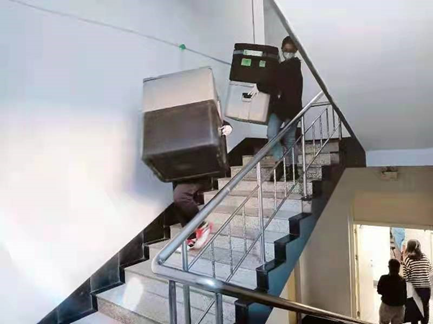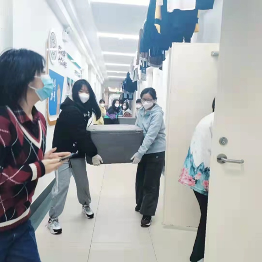 南四一楼到六楼的距离,几分钟,几十米。她们担负起为同学们送饭送水的责任,每一步、每一米都有着非凡的意义。从楼下到楼上,来回折返搬运,虽大汗淋漓,但没有人停下,一步一个脚印,尽快给同学们运送防疫生活物资,是这群女孩们最坚定的信念!