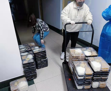 一栋宿舍楼,六个楼层,450多个宿舍,1300多份餐食,如此巨大的工作量让女孩们的身体逐渐吃不消了,南四的保洁阿姨为志愿者们带来了宝藏小推车,送餐送水的效率大大提高!没有一个冬天不可跨越,没有一个春天不会来临,只要我们不言放弃,共克时艰,万千灯火汇聚,必定能点亮漫漫长夜!