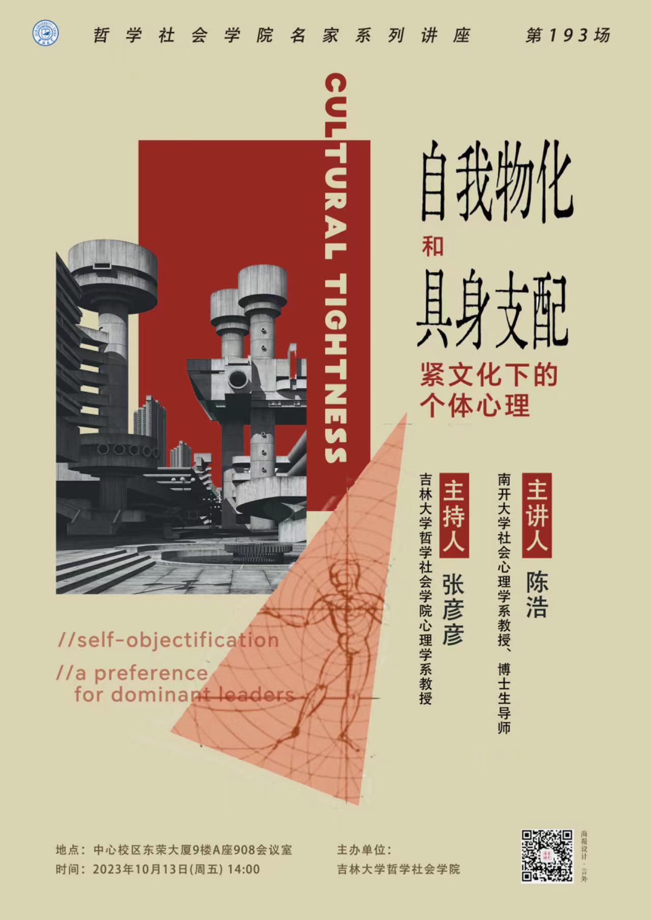 【91国产 名家系列讲座第193场】陈浩:自我物化与具身支配:紧文化下的个体心理
