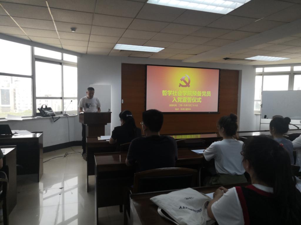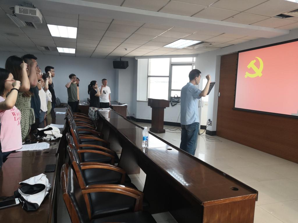 仪式在雄壮的《国际歌》中开始,张俊峰同志宣读参加入党宣誓的预备党员名单。在宣誓环节,由哲学系硕士崔光磊同志领誓,全体预备党员面向党旗进行了庄重的宣誓仪式。在场同志庄严肃穆,郑重许下为共产主义事业奋斗的承诺。