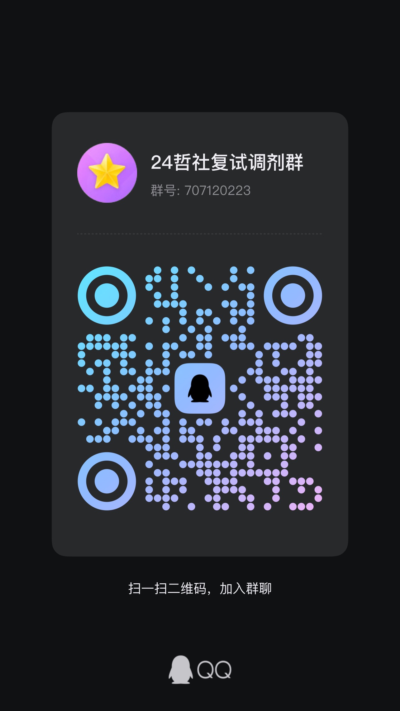 请参加调剂复试的同学及时加入调剂复试QQ群(见下方群二维码,加群申请格式:姓名+调剂专业+身份证后6位),持续关注QQ群内的通知,保持电话畅通,如有变化请以QQ通知为准。