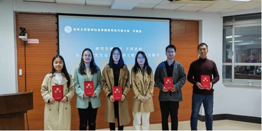 师生服务过的研究生会成员表示感谢,并对参加竞选的同学寄予深切期望,希望研究生会能继续坚持以服务同学为宗旨,以锻炼自己为目标,勇于创新,积极地开展工作。在开幕式的最后,研究生辅导员于洋为上届研究生会及分团委主要干部颁发了聘书并合影留念。
