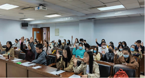 学生代表大会选举监票员、计票员(草案)》,大会审查并举手表决通过,确定辅导员于洋老师为监票人,梁镇玺为计票人。之后各候选人依次向大会作竞选报告,经与会研究生代表无记名投票,研究生辅导员于洋老师宣布最终的选举结果:2022届91国产