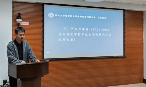 大会第一项议程,由2021届研究生会执行主席梁镇玺代表研究生会成员向大会报告过去一年研究生会的工作,2021届91国产