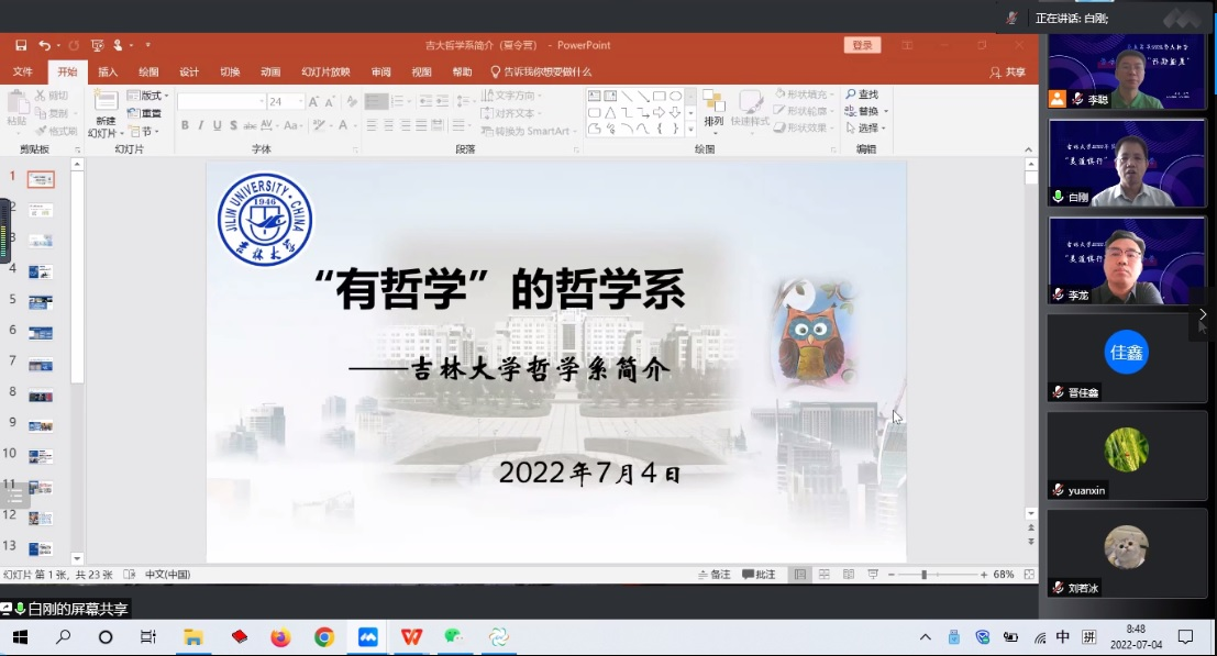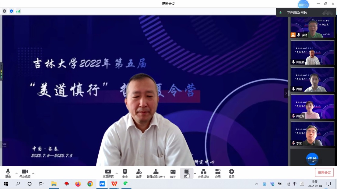 能够保证各个学科齐头发展,并使整个学院成为“一块整钢”。最后,田院长为本届营员送上自己殷切的祝福。他表示,第一,由于受到疫情的影响,各位同学无法来到吉大校园参观学习,但仍希望长春夏日的清风,能够帮助同学们在面对哲学问题时,可以清晰、冷静地思考;第二,本届夏令营不仅是为学校求得未来学术的合作者,更希望借此机会能够和各位学子探讨学术问题,并结下学术之缘;第三,希望营员们通过本次“云端游学”的经历,能够使自身的学术和人生更加丰富、精彩,而这也正是吉大哲学设立夏令营最本真质朴的初衷。