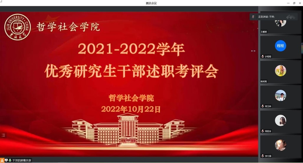 于10月22日召开2021-2022学年优秀研究生干部线上述职考评会。学院主管研究生思政工作党委副书记赵洁老师、副院长曲红梅教授、主管本科生思政工作党委副书记刘培强老师、研究生办公室主任傅瑜慧老师、研究生各学生党支部书记、研究生辅导员于洋老师、本科生辅导员宋绍伟老师及研究生学生代表参加此次会议.