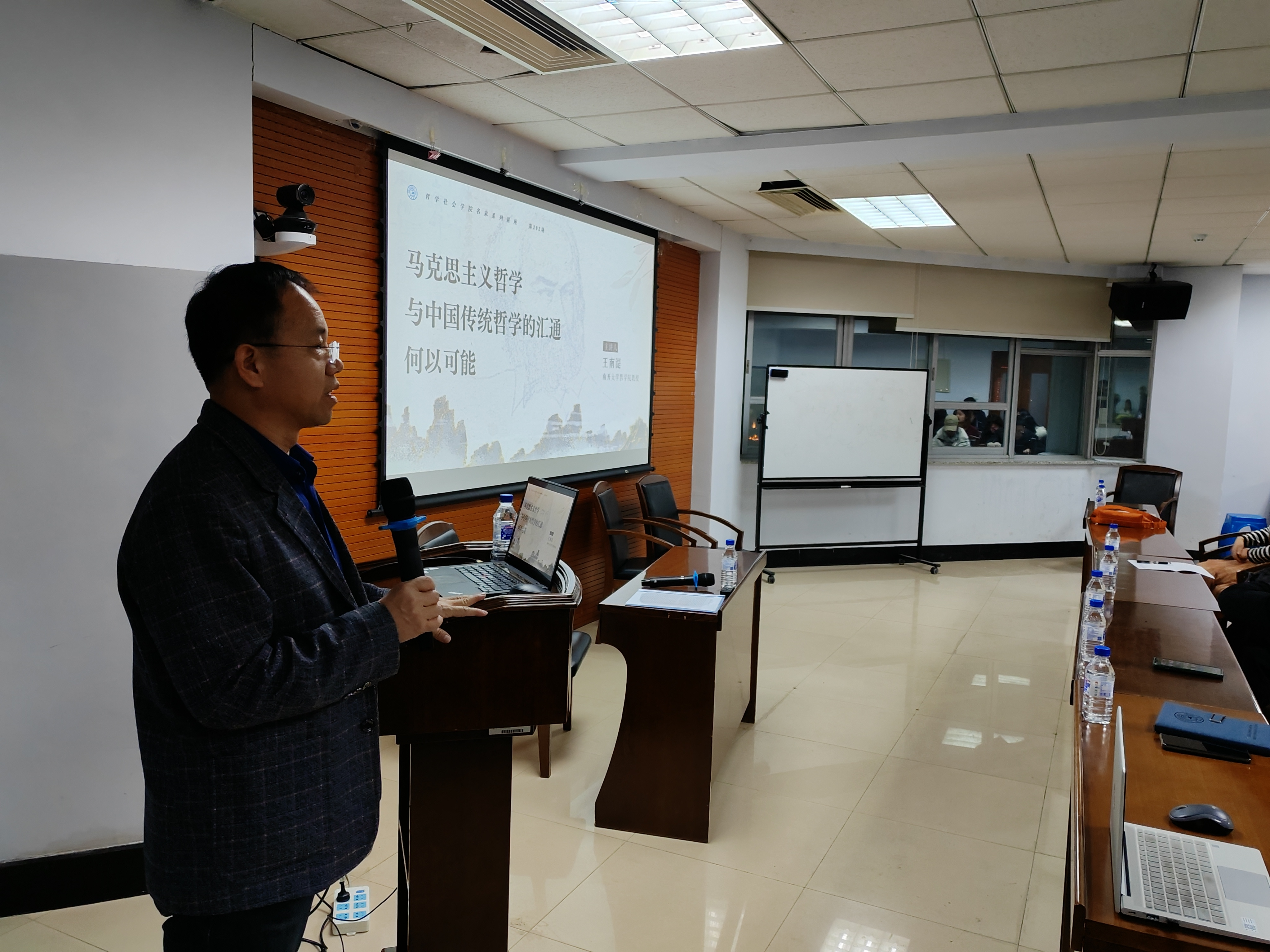 接下来,王南湜教授以“马克思主义哲学与中国传统哲学的汇通何以可能”为主题展开了本场讲座。王南湜教授认为,马克思主义哲学与中国传统哲学的汇通何以可能的问题,实质就是二者之间的高度契合性何以可能的问题,这种契合性并不是指在形式上将二者之间的相似性予以简单罗列,由于马克思的哲学是西方历史文化的产物,对马克思主义哲学与中国传统哲学高度契合性何以可能的探讨,应当建立在理解西方传统哲学与中国传统哲学根本差异的基础之上。中西哲学的根本差异在于呈现出了两种不同的本体论,中国哲学是天人一体的本体观,而西方哲学的本体观则将理念或上帝设定为超越性存在的本原之物。在此意义上,虽然马克思的哲学诞生于西方历史文化的背景之中,但马克思却以“人是对象性活动”的本体论基本原理,消解了超越性存在物的本体与现实世界中现象之间的二元矛盾。鉴于此,较之中国哲学中的天人一体的本体观同样否认了超越性本体的存在,马克思的“人是对象性活动”的本体观便同中国传统哲学的致思取向具有内在的契合性。