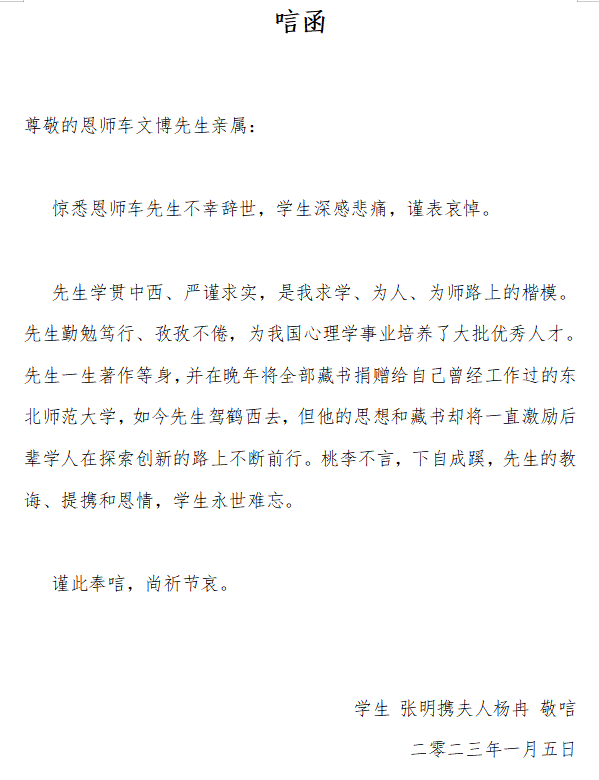 学生张明携夫人杨冉唁函