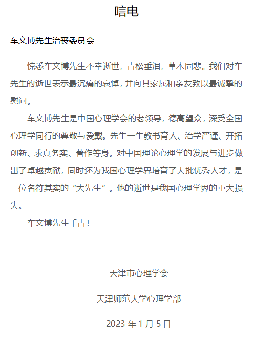 天津市心理学会天津师范大学心理学部唁电