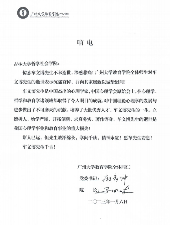 广州大学教育学院唁电