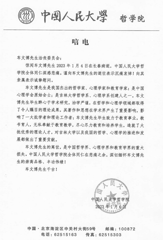 中国人民大学哲学院唁电